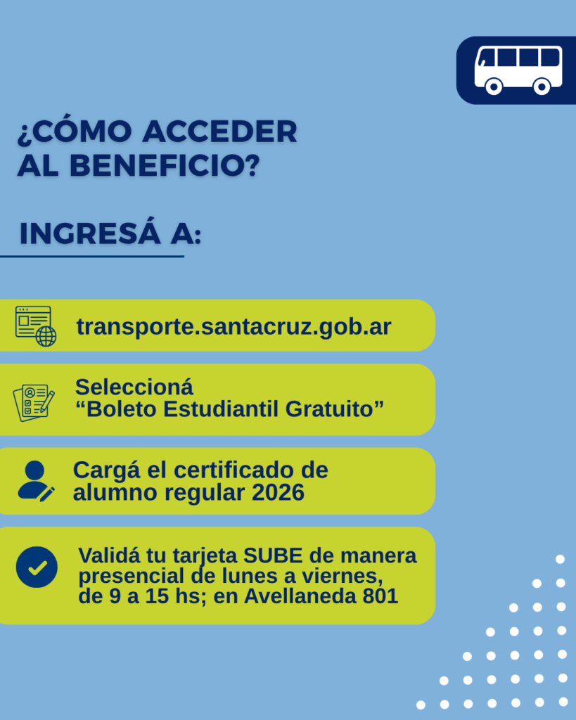 Una vez completado el trámite, en Río Gallegos deberán acercarse a las oficinas de la Subsecretaría de Transporte, ubicadas en Avellaneda 801, con DNI y tarjeta SUBE para la activación del atributo estudiantil. La cobertura se extiende desde el 2 de marzo hasta el 18 de diciembre. En las localidades del interior, la validación del beneficio se realiza en las oficinas de las empresas de transporte correspondientes.